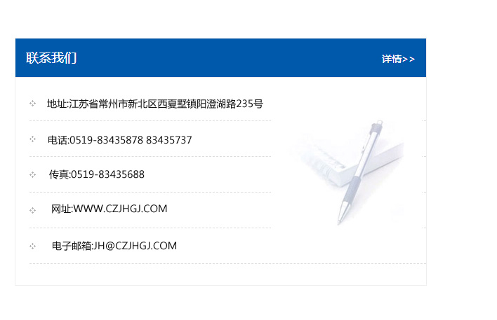 地址:常州市新北區友邦商務大廈1幢16、17層  電話:0519-85101652  傳真:0519-85112595  郵編:213022  網址:www.cz-jiayue_cn.xyglsj.com  郵箱:xiajifengaa@163.com